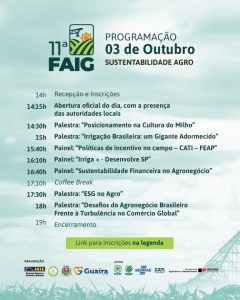 No dia 3, o foco vira para a SUSTENTABILIDADE AGRO, com uma agenda densa que aborda “Posicionamento na Cultura do Milho”, o painel “Irrigação Brasileira: um Gigante Adormecido”, discussões sobre políticas públicas com a CATI-FEAP e temas cruciais como” ESG no Agro” e “Sustentabilidade Financeira no Agronegócio”.