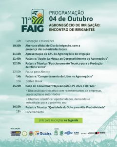 O encerramento, dia 4, é todo dedicado ao AGRONEGÓCIO DE IRRIGAÇÃO, com o Encontro de Irrigantes. O evento contará com a presença de autoridades, palestras técnicas sobre produção de milho verde e liderança, e uma importante Roda de Conversas para o “Mapeamento CPL 2026”, definindo estrategicamente os rumos para o próximo ano.