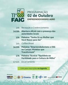 A programação do Agro Inova está estruturada em três pilares fundamentais. A jornada começa no dia 2 de outubro com o eixo EMPREENDEDORISMO AGRO, trazendo desde a palestra motivacional “Tenha Fé na Mulher que Você Nasce para Ser” até temas estratégicos como “Empreendedorismo e ESG no Campo” e a palestra técnica “Equilíbrio na Fertilidade para a Cultura de Milho”.