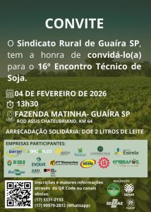 Com mais uma edição, o Sindicato Rural de Guaíra reafirma seu compromisso com o desenvolvimento do setor, preparando os produtores para os desafios e oportunidades de um agro cada vez mais moderno, competitivo e sustentável. O 16º Encontro Técnico de Soja promete, mais uma vez, deixar sua marca na história da agricultura de Guaíra.