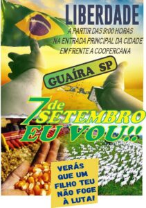 Está marcada uma grande concentração na entrada da cidade, em frente ao Coliseu, com uma tenda para distribuição de adesivos, bandeirinhas e também um um Silk em tinta preta, para para quem tiver camisetas brancas, amarelas, verde ou azul claro. A carreata pela cidade, terá como principais objetivos, as pautas oficiais dos atos de rua, tais como a celebração dos 200 anos de independência do Brasil, a defesa das liberdades, o respeito à democracia e a demanda por eleições transparentes. acompanhada de trio elétrico, que depois ficará na concentração no Recinto da Festa do Peão até as 14 horas