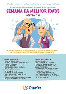 O evento é organizado pelo Fundo Social de Solidariedade de Guaíra em parceria com os setores da Prefeitura, incluindo a Diretoria de Assistência Desenvolvimento e Inclusão Social (Dadis), a Diretoria de Educação, os Departamentos de Esportes e Cultura e o Setor de Almoxarifado Marcado começou no dia 19 e irá até dia 27 de setembro tendo como lema: “Cuidar da Nossa Melhor Idade é Preservar Nossa História – Envelhecer é Inevitável, Ficar Velho é Opcional”.