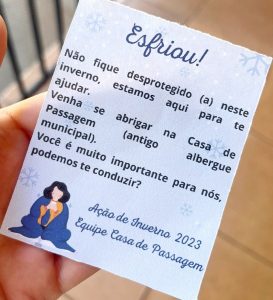 Para facilitar a identificação e o atendimento das pessoas que precisam de auxílio, a Diretoria de Assistência de Guaíra pede que a população colabore, informando casos de pessoas que estejam em situação de rua e precisem de cuidados. Para isso, basta ligar para o contato 3332-1258, que a equipe da Casa de Passagem fará a abordagem, acolhimento e encaminhamento.