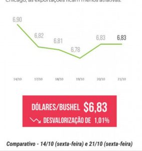 As exportações seguiram aquecidas no Brasil. De acordo com a Secretaria de Comércio Exterior (Secex), até a segunda-feira (17/10), havia sido exportado 80% a mais que todo mês de outubro de 2021. Isso reforçou a expectativa de que o mês de outubro possa superar o mês de agosto deste ano, que foi o maior até agora. Chicago finalizou a semana com queda de -1,01%, valendo 6,83 dólares por bushel. Já o dólar teve