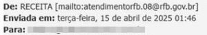 Atenção: O objetivo é claro: fazer você clicar em um link para “resolver” a situação rapidamente, instalando malware em seu dispositivo ou redirecionando-o para boletos falsos. A Receita Federal é taxativa: ela NUNCA envia e-mails com links ou alertas de cobrança! Os e-mails de atendimento são usados apenas para responder a demandas que você mesmo iniciou.