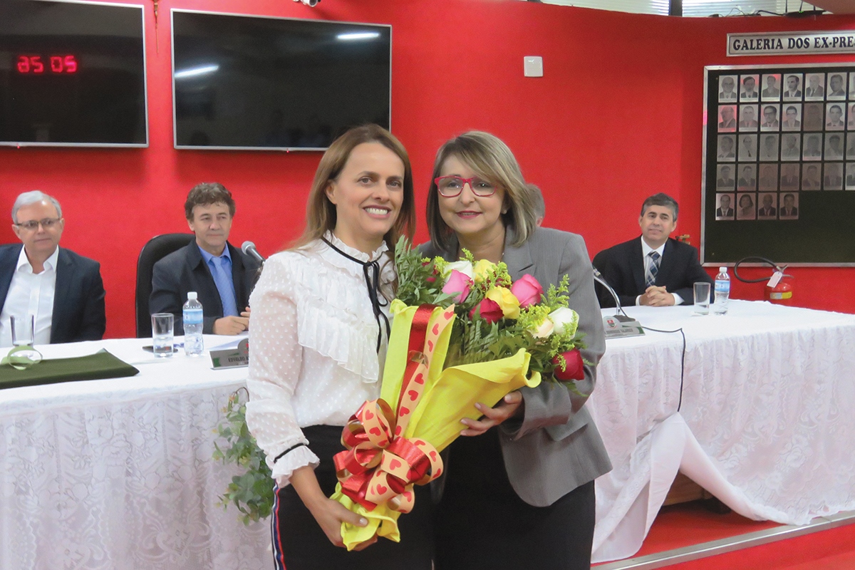 A vereadora Maria Adriana faz entrega de uma ramalhete de rosas para esposa do homenageado, Roseli.
