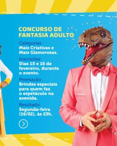 E a diversão não para por aí. Paralelamente, acontece o Concurso de Fantasia Adulto, valorizando a criatividade e o glamour nos três dias de festa. As inscrições serão realizadas nos dias 15 e 16, durante o evento, nas categorias de Fantasia Mais Criativa e Fantasia