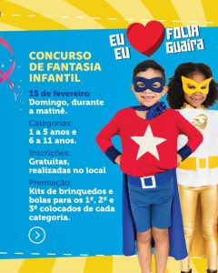 O Concurso de Fantasias Infantil acontece no domingo (15), durante a matinê que começa às 15h. A participação é gratuita, com inscrições no local, e as crianças serão divididas nas categorias de 1 a 5 anos e de 6 a 11 anos. Os três primeiros colocados de cada uma receberão kits de brinquedos.