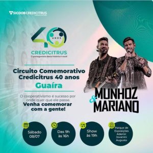 O evento se encerrará com um show de Munhoz e Mariano, com início às 19h e término às 22h. “Teremos em nossa cidade um dia que marcará a comunidade Guairense e a Credicitrus, pois o propósito de Cooperativa de ‘somar forças para gerar prosperidade, transformar vidas e desenvolver à comunidade’ estará expresso em cada ação, nas empresas parceiras do Marketclub, nas instituições sociais que estarão vendendo alimentos e bebidas, nas atividades de entretenimento e na intercooperação com as cooperativas Unimed e Uniodonto. Somos um time único ressaltando o valor do cooperativismo”, comenta o gerente de Guaíra, Altanir Marini Netto.