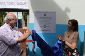 Logo após a cerimônia, Junão e Adriana fizeram o descerramento da placa de inauguração da Horta Escolar e todos os participantes conheceram o projeto.