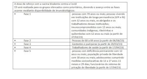 Para a população que ainda não está elegível para a realização de dose de reforço com vacina contra Covid-19 bivalente, deve-se seguir o esquema de vacinação com doses de reforço com vacinas contra Covid-19 monovalentes.