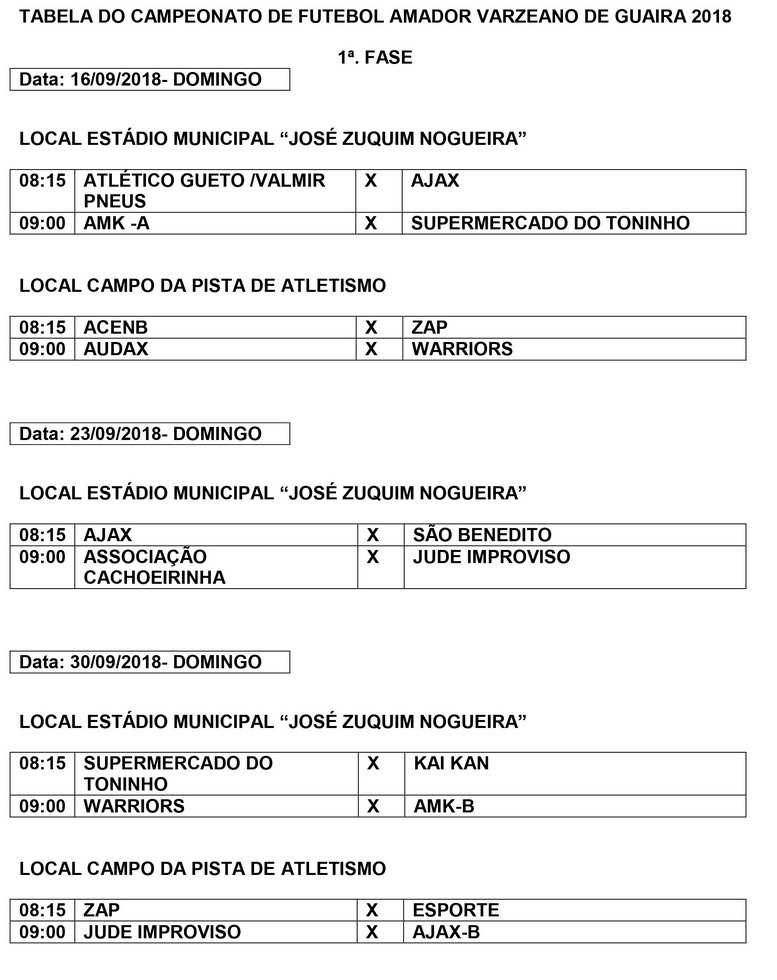 A Prefeitura Municipal, por meio do Departamento de Esportes e Lazer, dará início neste domingo, dia 16, ao Campeonato Amador Varzeano 2018. A primeira fase seguirá até o dia 21 de outubro, quando serão conhecidos os classificados para a segunda fase.