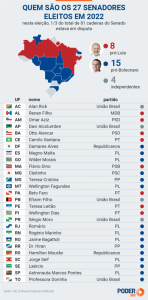 O União Brasil, fundado a partir da junção do Democratas e do Partido Social Liberal (PSL), garantiu cinco assentos no Senado e em 2023 terá 12 senadores. Já os petistas terão nove representantes e ficarão atrás do PSD, que terá dez, e do MDB, que perdeu três assentos e também sai do pleito com dez senadores.