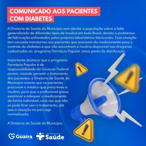 Importante destacar que o programa Farmácia Popular é de responsabilidade do Governo Federal, porém, visando garantir o tratamento dos pacientes, a Diretoria de Saúde do Município orienta que os pacientes procurem o médico que prescreveu a insulina, para que o profissional possa examinar e adequar o medicamento de forma individual, uma vez que não se pode ficar sem o tratamento.
