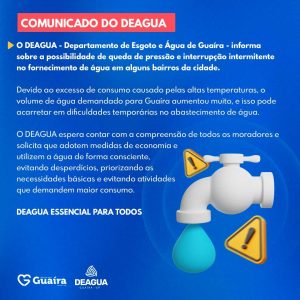 O DEAGUA espera contar com a compreensão de todos os moradores e solicita que adotem medidas de economia e utilizem a água de forma consciente, evitando desperdícios, priorizando as necessidades básicas e evitando atividades que demandem maior consumo.