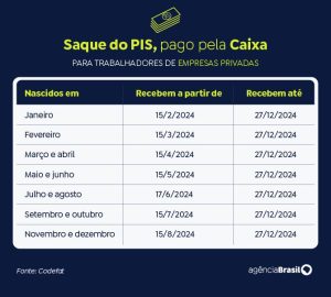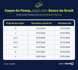 O PIS é pago pela Caixa Econômica Federal e o Pasep, pelo Banco do Brasil. Como ocorre tradicionalmente, os pagamentos serão divididos em seis lotes, baseados no mês de nascimento, no caso do PIS, e no número final de inscrição, no caso do Pasep. O saque iniciará nas datas de liberação dos lotes e acabarão em 27 de dezembro de 2024. Após esse prazo, será necessário aguardar a convocação especial do Ministério do Trabalho e Previdência.
