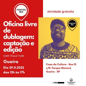 Para acelerar seu sonho de ser um dublador, está aberta desde a última na sexta-feira (18), dia 18, as inscrições para a Oficina livre de dublagem: captação e edição. A capacitação gratuita, que ocorre no dia 29 de novembro das 13h às 17h, na Casa de Cultura Professor João Augusto de Mello, será ministrada pelo professor Ítalo Yuri e voltada para os interessados na produção de material audiovisual.