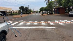 Entre os serviços realizados estão a revitalização de faixas de pedestres, linhas de retenção, sinalização de proibição de estacionamento e áreas de estacionamentos, sempre seguindo critérios técnicos e normas vigentes de trânsito.