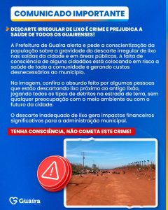 É importante ressaltar que Guaíra conta com serviços regulares de coleta para diversos tipos de detritos, como lixo doméstico e resíduos de limpeza de quintais. Dessa forma, não há justificativa para o descarte em locais impróprios.