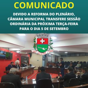 Diante da reforma que está sendo realizada no Plenário da Câmara Municipal, a sessão ordinária que seria realizada no próximo dia 29 de agosto, foi transferida para o dia 5 de setembro.