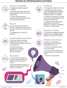 A distribuição de material gráfico, as caminhadas e propagandas em mídias impressas e internet estão autorizadas até 1° de outubro, véspera das eleições. No dia da votação, a propaganda eleitoral é proibida, como explica a professora de direito da FGV do Rio de Janeiro, Silvana Batini.