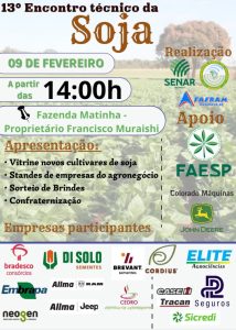 “O Sindicato Rural, como entidade organizada representante da FAESP e dos produtores rurais estaremos trazendo as informações para os produtores rurais, bem como os maquinários que estarão sendo expostos nos estandes durante o encontro técnico de soja. Quero convidar todos os nossos amigos produtores para mais este grandioso evento”, frisou Francisco Muraishi.