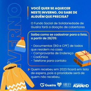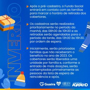 Após o pré-cadastro, o Fundo Social entrará em contato com as famílias para marcar o horário de retirada dos cobertores. Os cadastros serão realizados prioritariamente no período da manhã, das 08h30 às 10h30 e as retiradas serão agendadas para o período da tarde, das 13h30 às 16h30, por ordem de espera. Os cobertores serão liberados uma unidade por família e, conforme a entrada de mais doações, serão contempladas primeiramente as pessoas da lista de espera de reincidência e após.