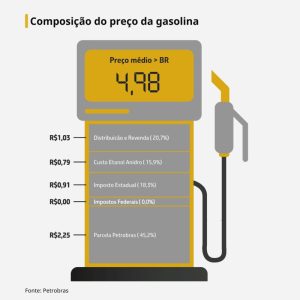 O preço médio do litro da gasolina no Brasil entre 15 e 21 de janeiro foi de R$ 4,98, de acordo com a Petrobras. Segundo a companhia, desse valor, R$ 2,25 são parcela da própria empresa. Esse valor deverá ser de R$ 2,42 com o reajuste anunciado esta semana. Vale lembrar que, desde o ano passado, os impostos federais sobre o combustível estão zerados. A medida deve durar, pelo menos, até 28 de fevereiro deste ano.