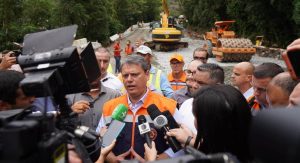 Ainda nesta quarta-feira, Tarcísio de Freitas vistoriou o andamento das obras de liberação e recuperação da Estrada Mogi-Bertioga (SP-098), na altura do quilômetro 82 da via. Equipes do Departamento de Estradas de Rodagem (DER) trabalham na remoção de rochas que caíram na rodovia por conta das fortes chuvas, no recapeamento asfáltico e na implantação de telas de contenção de encostas.