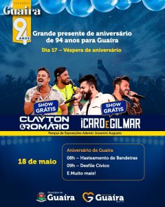 O Chefe do Executivo fez o convite. “Estamos trazendo sucessos do sertanejo para nossa Guaíra. Lembrando que os portões serão abertos apenas no dia 17. Vamos curtir os shows de Clayton & Romário e Ícaro & Gilmar no recinto da festa, como comemoração do aniversário e aproveitar bastante, pois no outro dia teremos a continuação da programação durante o dia, com nossos eventos cívicos, que prometem emocionar o público”, diz.