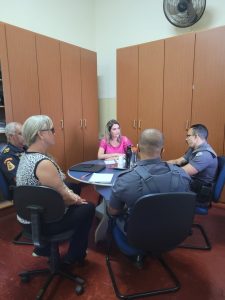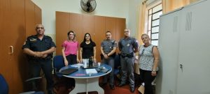 Legenda foto : Reginaldo Izaias, comandante da GCM. Simone Sampaio, chefe da Educação Fundamental, Maria Angélica Rebello, Diretora Municipal de Educação, Capitão Villela comandante da PM, Soldado, Fonseca, instrutor da Proerd local e Naiara Borghetti do Carmo, chefe do Ensino Infantil)