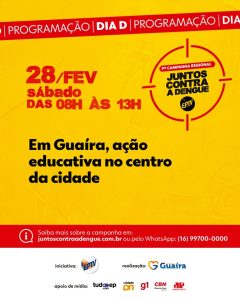 “O Dia D é o momento de unirmos forças com a campanha regional da EPTV para mostrar que a dengue é uma responsabilidade de todos. Precisamos que a população de Guaíra mantenha o hábito de vistoriar seus quintais semanalmente”, destaca o chefe da Vigilância em Saúde, Wilker Gléria.