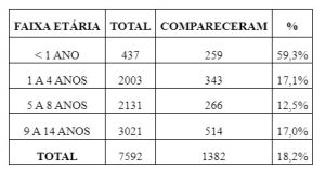 Por outro lado, a menor procura foi registrada pela população de 5 a 8 anos, com apenas 12,5% de participação. A faixa etária de 9 a 14 anos, por sua vez, a mais numerosa, registrou uma baixa taxa de imunização com 17% de cobertura até o momento.