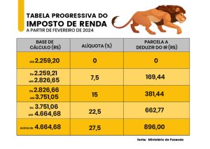 “O Imposto de Renda funciona da seguinte forma: o imposto tenta ser, de certa forma, justo com quem recebe menos. Então, quanto mais você recebe de renda, mais imposto você paga. Quanto menos renda você tem, menos imposto você paga. Quem recebe mais de R$ 4 mil vai pagar uma alíquota de 27,5% em cima do que recebe.