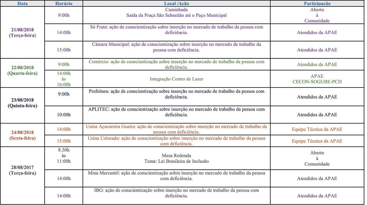 Começou na terça-feira (21), a Semana Nacional da Pessoa com Deficiência Intelectual e Múltipla integrada à Semana Municipal de Prevenção às Deficiências, que vai até 28 de agosto. O evento, promovido pela Diretoria de Assistência, Desenvolvimento e Inclusão Social e a Associação de Pais e Amigos dos Excepcionais, envolve diversas ações e tem como tema a “Inclusão profissional com a integração da pessoa com deficiência na sociedade com o olhar voltado ao mercado de trabalho”.