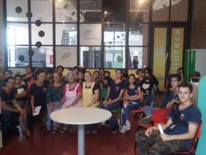 Na semana seguinte, mais precisamente no dia 18 de agosto, a Biblioteca Comunitária Energia do Conhecimento recebeu, no período da tarde, alunos e educadores da Etec Coronel Raphael Brandão, de Guaíra. Foi a oportunidade para que Tia Téca apresentasse aos estudantes a Biblioteca e as inúmeras possibilidades oferecidas gratuitamente para a comunidade por esse espaço consagrado à leitura. Ela também falou aos estudantes sobre o funcionamento do Centro Cultural, núcleo do IORM em Guaíra, e importante equipamento para a arte, a cultura e a convivência na cidade.