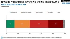 De acordo com a pesquisa, 57% dos entrevistados disseram que o ensino médio prepara pouco ou não prepara os estudantes para o ensino superior. O mesmo percentual se repete em relação à preparação para o mercado de trabalho: 57% dos brasileiros acham que os alunos não estão preparados ou são pouco preparados para o ramo do trabalho.