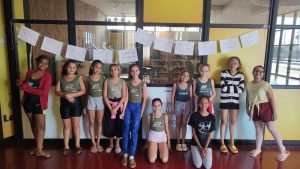 A partir de onze balões dourados compondo as letras que formam as palavras ballet e dança, fixados na parede da biblioteca, foi solicitado que as alunas observassem atentamente e escrevessem ambos os verbetes. Para isso, cada aluna recebeu folha sulfite, cola branca líquida e glitter em pó dourado para que registrassem as duas palavras. A ação teve o objetivo de propor a experimentação do prazer de escrever palavras muito usadas no curso ao qual se dedicam.