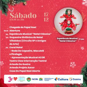 Quem abre a festa no final da tarde de sábado (17) é ele, o Papai Noel, personagem mais esperado da festa, particularmente, pela parcela de público que mais incorpora o clima de natal, as crianças. Ele traz consigo uma grade eclética, porém sem perder o foco que é despertar o espírito natalino na comunidade. As atrações vão desde a tradicional Casa do Papai Noel, com o Bom Velhinho recebendo as crianças para ouvir seus pedidos de Natal, até exposição de trabalhos dos artesões locais, enaltecendo a apresentação de música clássica com a Orquestra Villa-Lobos, de Votuporanga, também as já consagradas peças natalinas, do Teatro Clow, isso tudo temperado com tradicionalismo popular da Folia de Reis Estrela do Amanhã e o Presépio Vivo e as pratas da casa, com apresentação de música e dança da Acor – Associação de Desenvolvimento Cultural Águas Correntes.