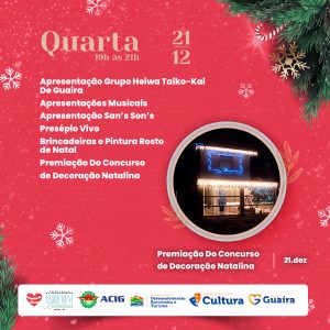 Nesse encargo, o apoio dos comerciantes, mobilizados pela Acig – Associação Comercial e Industrial de Guaíra – foi imprescindível na realização dos eventos: Natal Encantado e Concurso Natalino, que receberam patrocínios de empresas privadas que se reverterá em entretenimento para o povo e aumento de negócios para o comércio.