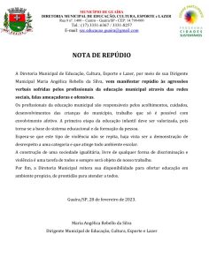 A diretora da pasta, Maria Angélica Rebello da Silva, emitiu nota de repúdio, em nome de toda a equipe da diretoria, para defender os profissionais da educação que sofreram ataques e ofensas pessoais por algumas pessoas através das redes sociais, nos últimos dias. Confira.