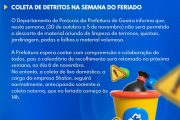 O Departamento de Posturas da Prefeitura de Guaíra informa que, nesta semana (30 de outubro a 5 de novembro) não será permitido o descarte de material oriundo de limpeza de terrenos, quintais, jardinagem, podas, folhas e material volumoso. A Prefeitura espera contar com compreensão e colaboração de todos, pois o calendário de recolhimento será retomado […]