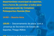 O Complexo Esportivo Ramize Elias volta às atividades com presença do Secretário Estadual de Esportes, Thiago Milhin Depois de passar por uma revitalização que incluiu a troca de todo o piso das quadras, pintura interna e externa, o Complexo Esportivo Ramize Elias será reinaugurado nesta quarta-feira, dia 14. O descerramento da placa de reinauguração […]
