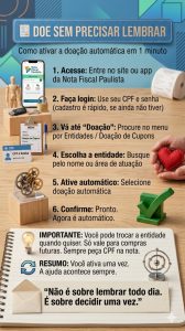 Ao ativar essa funcionalidade dentro da Nota Fiscal Paulista, o consumidor permite que todos os créditos gerados a partir das compras com CPF sejam direcionados diretamente a uma entidade escolhida. Dessa forma, a contribuição passa a ocorrer de maneira contínua, sem a necessidade de ações repetidas a cada nova compra.