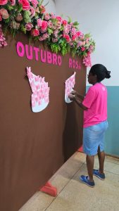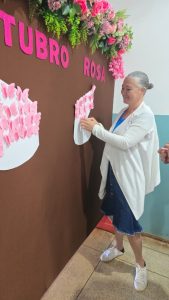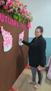 A enfermeira da unidade, Yeda Minoda do Nascimento, conduziu a palestra, orientando sobre a importância do autoexame, da mamografia e do diagnóstico precoce, chave para o sucesso do tratamento.