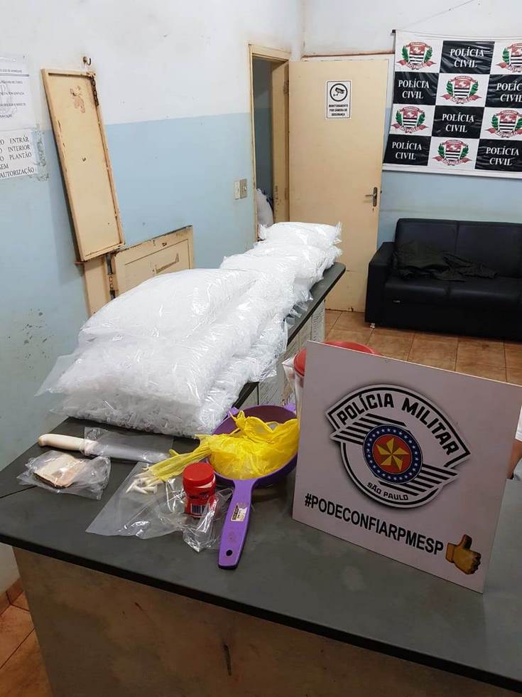 Os policiais receberam uma denúncia anônima e seguiram para a casa de um dos suspeitos na rua 22 B, no bairro Jardim Califórnia e com ele encontraram uma peneira, 68 eppendorfs vazios, um copo de liquidificador com resquício de pó branco e uma embalagem de fermento em pó químico contendo a mesma substância.