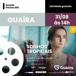 A sessão de cinema “Pontos MIS”, programa de formação e difusão cultural, acontece com apoio da Prefeitura de Guaíra, em parceria com o Museu da Imagem e do Som de São Paulo, instituição da Secretaria de Cultura e Economia Criativa do Governo de São Paulo.