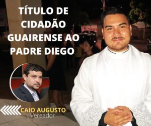 O vereador Caio Augusto destacou a importância desta homenagem. “Padre Diego, desde que chegou em Guaíra no ano de 2020 tem desenvolvido um importante trabalho de evangelização na comunidade da Nossa Senhora Aparecida, com várias ações comunitárias, sociais e filantrópicas. Hoje, ele que nasceu na cidade de Monte Azul Paulista será chamado de guairense com o título concedido pela nossa Câmara Municipal. Muito feliz em ter contribuído para este reconhecimento ao Padre Diego que merece todo nosso carinho e admiração”, comentou ele.