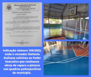 Nesta semana, o vereador Stefanio Stafuzza recebeu a boa notícia que o trabalho de recuperação das quadras esportivas foi iniciado, inclusive, com a reforma e pintura do espaço esportivo localizado na escola municipal Padre Mário Lano.