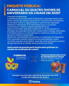 A administração municipal reforça seu compromisso com a continuidade dos serviços públicos essenciais e a conclusão dos investimentos estruturantes. Para otimizar recursos, a população está convidada a escolher entre duas opções: a realização do tradicional Carnaval (CarnaGuaíra Eu Amo Folia) ou a promoção dos quatro shows gratuitos que compõem a programação de aniversário da cidade, realizados durante a Festa do Peão.
